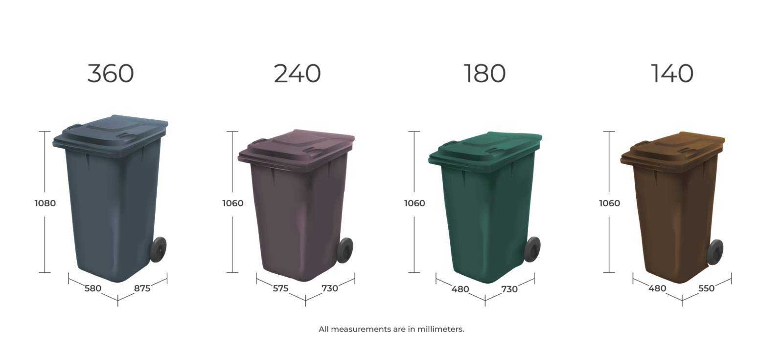 • 240Lt wheelie bin: 580 x 600 x 1075mm high.